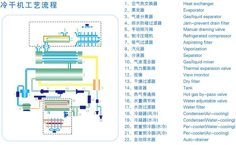 冷冻式干燥器分为风冷标准型(低、高温型)、水冷标准型(低、高温型)、特殊型(高温,高压、低压、深冷、防爆等)处理量从1.7m3/ min到500m3/min: 压力露点2-10℃:控制方式有仪表、电子、 PLC 等多种。电源220V/1ph/50H•、380V/3ph/50Hz、110V/1ph/60H•、440V/3ph/50Hz,空气系统有不锈钢外筒体、铝外筒体, 还可以生产深冷干机、冷水机、冷却器等,可为您定制各种特殊要求的产品。